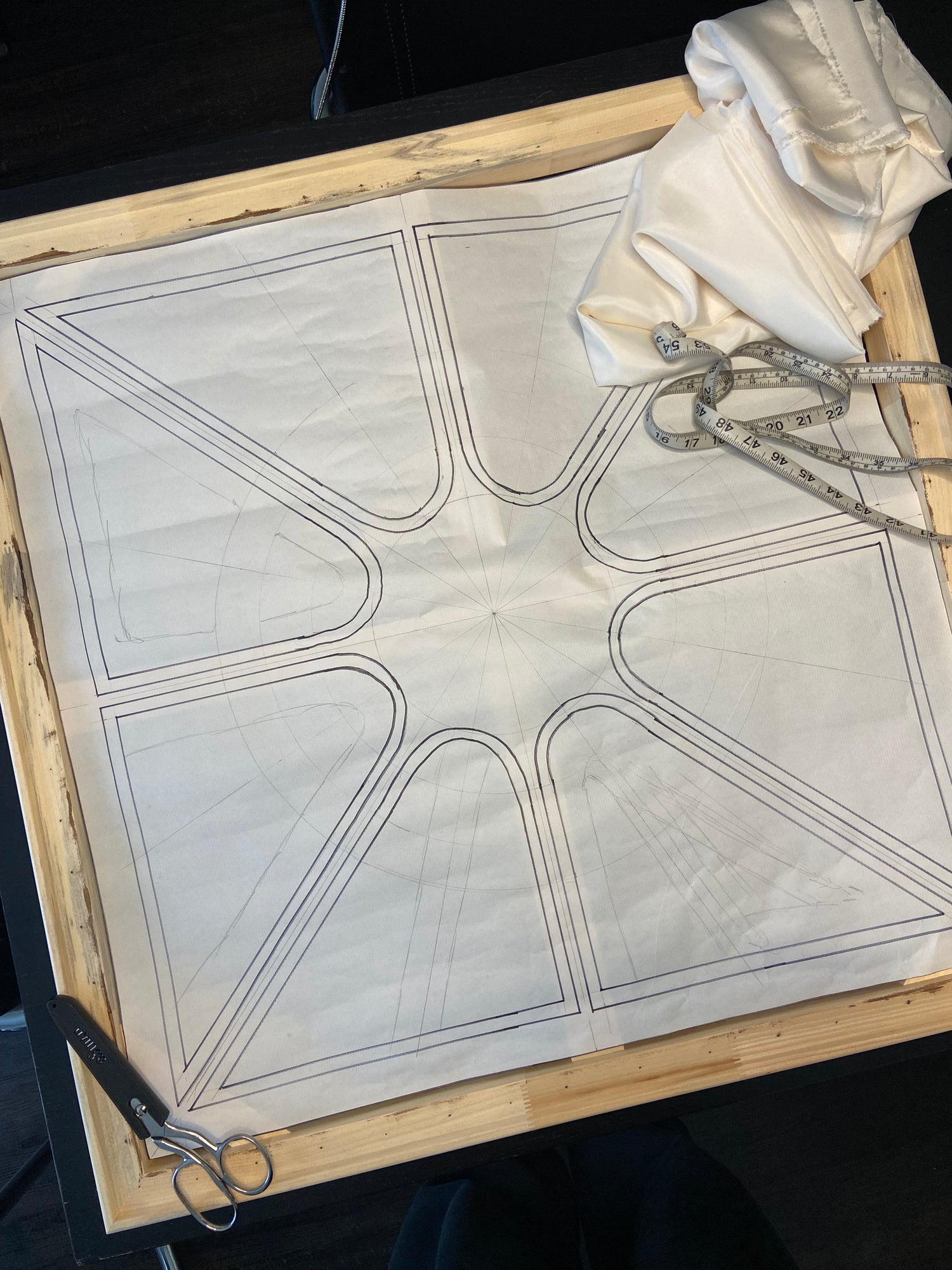 Each scarf begins with a hand-drawn sketch, scaled precisely to the frame. Lines define the structure and rhythm that guide the composition.